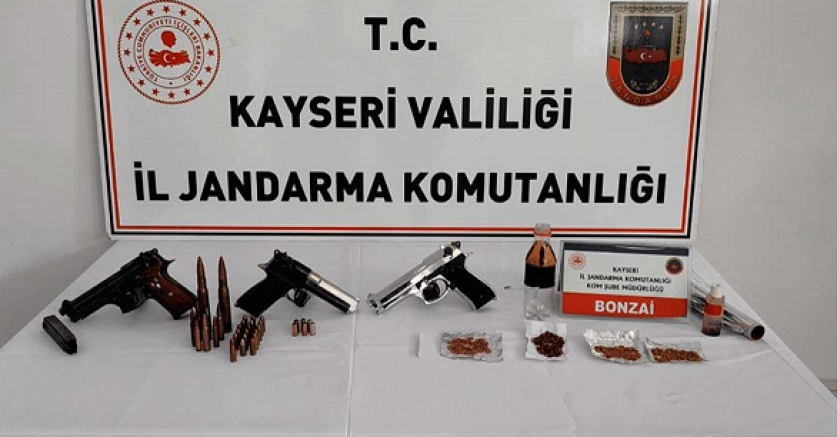 Operasyonda, 1110 gram bonzai, 150 gram metamfetamin, 5 gram esrar, 10 kök dişi hint keneviri, 10 gram kenevir tohumu, 2 uyuşturucu madde kullanma aparatı, ruhsatsız tabanca, 3 kurusıkı tabanca ve 20 mermi ele geçirildi.