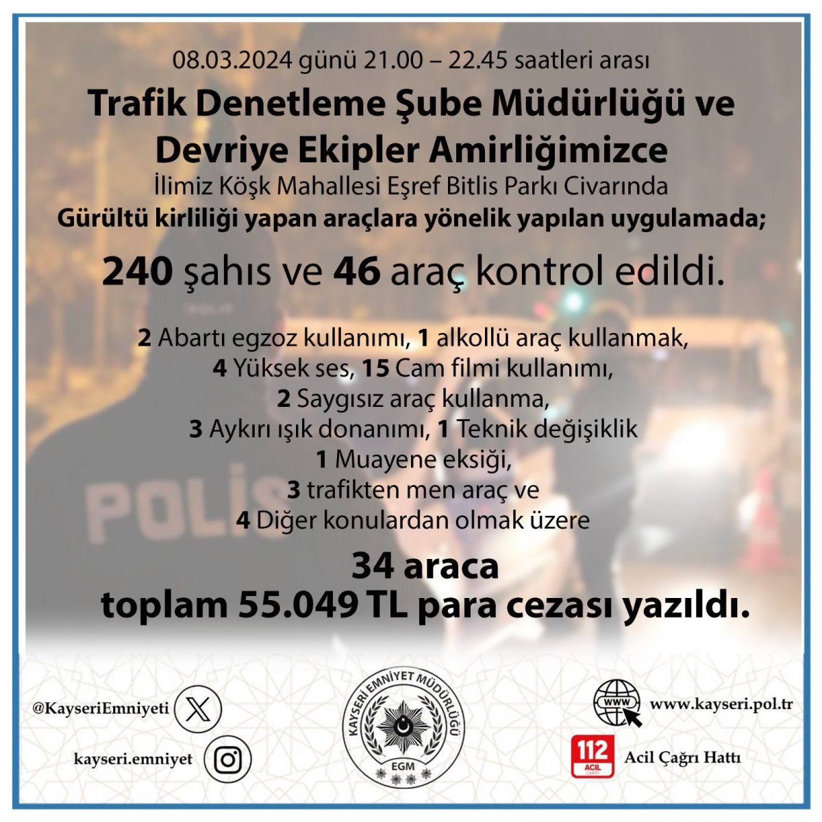 Kayseri İl Emniyet Müdürlüğü tarafından yapılan açıklamada ;''Kayseri İl Emniyet Müdürlüğü Trafik Denetleme Şube Müdürlüğü ve Devriye Ekipler Amirliği tarafından Melikgazi ilçesine bağlı Köşk Mahallesi Eşref Bitlis Parkı etrafında gürültü kirliliği yapan araçlara yönelik uygulamada 240 şahıs ve 46 araç kontrol edildi. 1 alkol,2 saygısız araç kullanma, 3 aykırı ışık donanımı, 1 teknik değişiklik, 2 abartı egzoz, 4 yüksek ses, 15 cam filmi, 1 muayene, 3 trafikten men araç ve 4'ü başka sebeplerden olmak üzere araçlara toplamda 55 bin 49 TL para cezası yazıldı.'' ifadeleri yer aldı.
