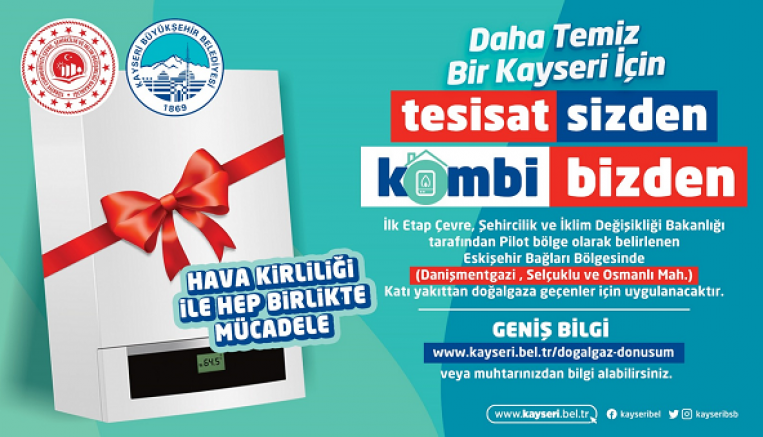 Kayseri Büyükşehir Belediyesi, Çevre, Şehircilik ve İklim Değişikliği Bakanlığının pilot bölge olarak belirlediği Danişmentgazi, Selçuklu ve Osmanlı mahallelerinin bulunduğu Eskişehir Bağları Bölgesi'nde hava kirliliğini önlemek için "Tesisat sizden, kombi bizden" kampanyası başlattı.
