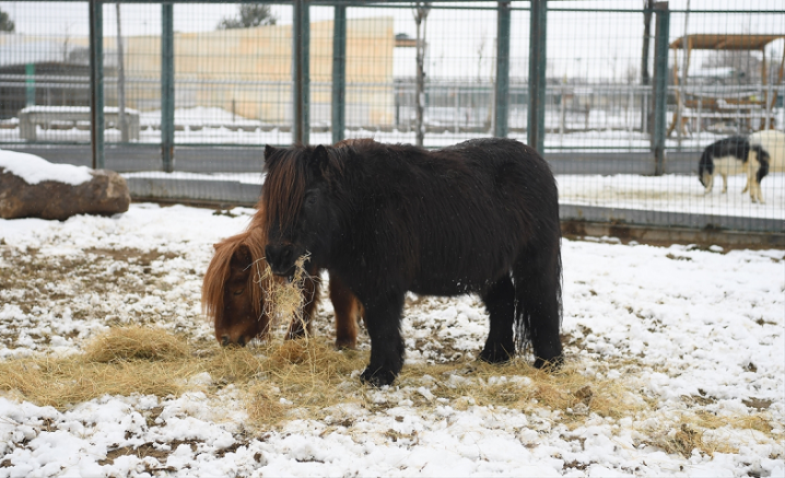 Kayseri Büyükşehir Belediyesine ait hayvanat bahçesinin sakinleri, karlı havanın keyfini çıkarıyor.