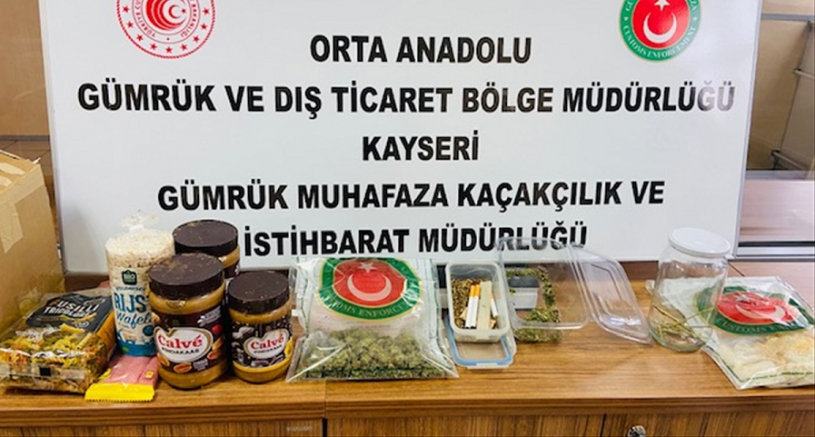 Kayseri'de, Hollanda'dan kargo ile gönderilen fıstık ezmelerinin içerisine gizlenmiş 120 gram esrar ele geçirildi.