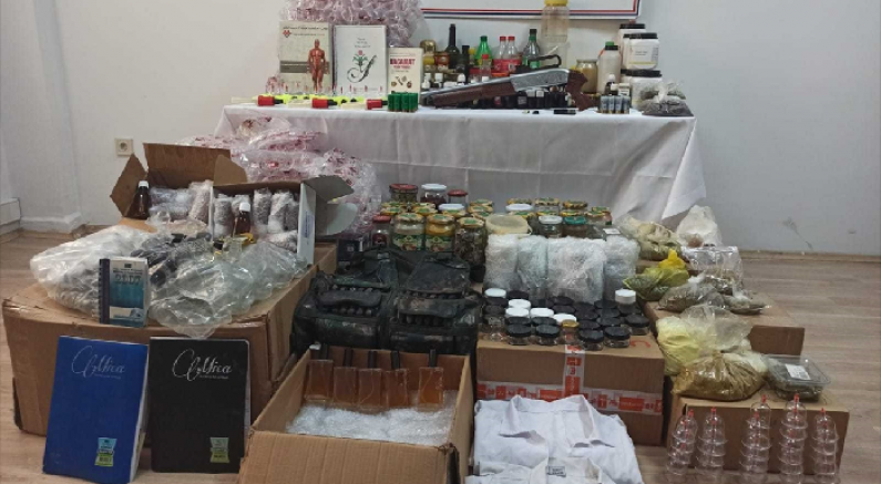Düzenlenen operasyonda ilaç yapımında kullanılan 23 kurutulmuş aktar ürünü, 28 cam şişe içerisinde ilaç yapımında kullanılan tıbbi aktar ürünü,144 cam şişe içerisinde içeriği belli olmayan tıbbi malzeme, 23 cam şişe içerisinde bitkisel sıvı karışımı, 8 plastik kutu içerisinde tedavi amaçlı kullanılan jel, 355 ilaç saklama boş cam şişesi, 38 ilaç saklamada kullanılan boş rimel kutusu,14 cam şişe içinde tıbbi karışım, 78 hacamat kupası,10 hacamat için kullanılan vakum tabancası,1 plastik su kabı içerisinde canlı 2 sülük, bir ruhsatsız av tüfeği ve 47 fişek ele geçirildi.