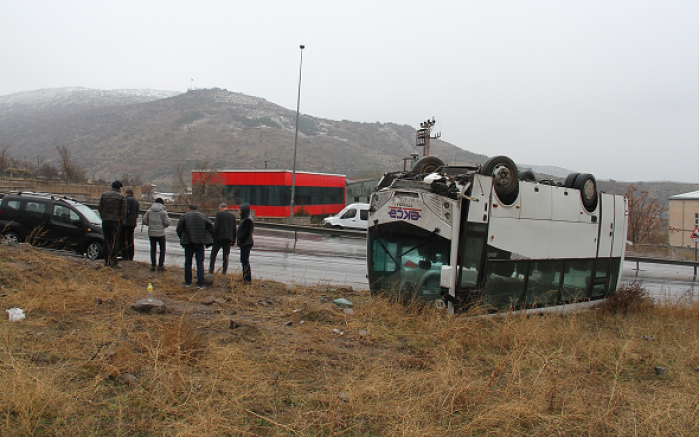 Kayseri Organize Sanayi Bölgesi'ndeki bir fabrikaya işçi taşıyan E.Ö idaresindeki 38 P 0793 plakalı midibüs, İnecik Mahallesi Fatih Sultan Mehmet Bulvarı'nda, yağış nedeniyle kayganlaşan yolda kontrolden çıkarak devrildi.