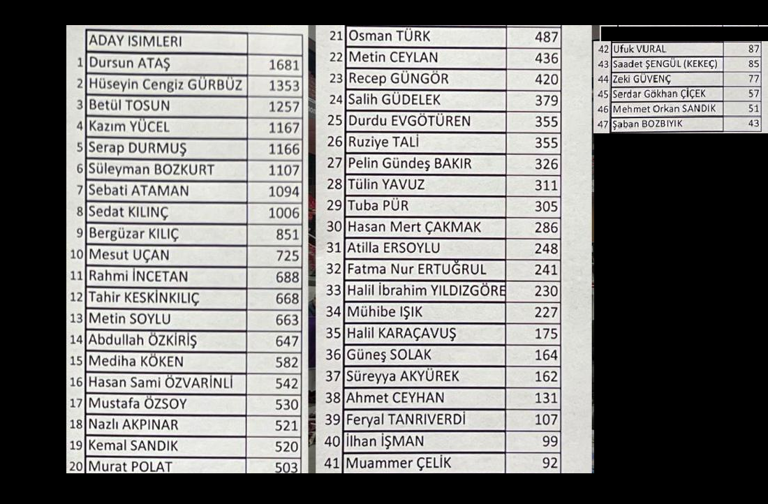Bu kapsamda Kayseri'de gerçekleştirilen teyamül yoklaması Kadir Has kongre merkezinde geniş katılımla gerçekleşti.Saat 17'de biten yoklamanın sonucunda aşagıda yer alan liste oluştu.