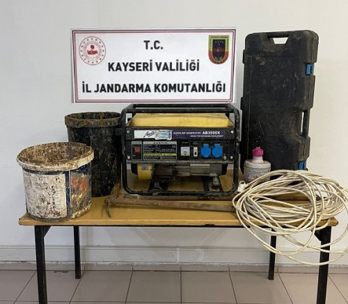 R.R, C.G. ve A.G'yi gözaltına alan ekipler, jeneratör, 30 metre kablo, kazma, 2 kova, kürek ve kırıcı alete el koydu.