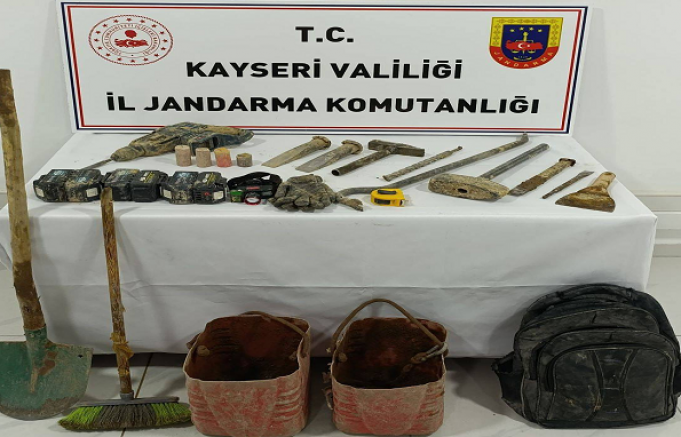 Valilikten yapılan açıklamada şu bilgiler kaydedildi;''Kayseri İl Jandarma Komutanlığı KOM Şube Müdürlüğü ve Develi İlçe Jandarma Komutanlığı tarafından yürütülen KOM faaliyeti kapsamında; Develi İlçesi Epçe Mahallesi Karaçakıl Mevkiinde icra edilen Önleyici Kolluk Devriyesi esnasında, A.Ş., C.T. ve M.Ş. isimli şahısların kaçak kazı yaptıkları tespit edilerek şahıslar suçüstü yakalanmışlardır. Olay yerinde bulunan 1 adet kürek 1 Adet fırça, 2 adet kova, 6 Hilti bataryası, 4 Adet mum, 1 Adet Bosch marka Hilti,1 Adet Sırt Çantası, 1Adet spatula, 1 Adet Balyoz,3 Adet Hilti Ucu, 1 Adet Çekiç,1 Adet Demir Murç keskisi,1 Adet Manila Demiri,1 Adet Metre ,1 Adet kask Feneri ve 1 Adet Pil ele geçirilmiştir. Olayla ilgili Kayseri Müze Müdürlüğü ile koordine kurularak tahkikata başlanmıştır.''