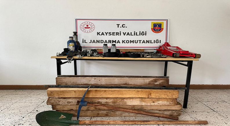 Olay yerinde, ayaklı kriko, murç, el testeresi, pense, kancalı bağlama zinciri, kazma, kürek ve yük taşımada kullanılan malzemeler ele geçirildi.