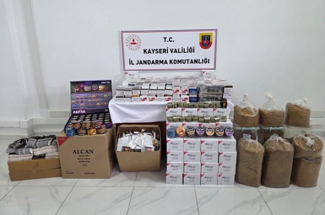 Kayseri'de Jandarma ekipleri tarafından yapılan çalışmalarda 26.240 adet içi tütün doldurulmuş makaron,30 kg sarmalık kıyılmış tütün, 5 kg bandrolsüz nargile tütünü, 2 kg maraş otu ele geçirildi.