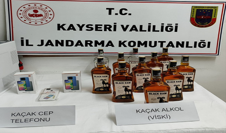 Kayseri'de kaçakçılık operasyonunda 10 litre bandrolsüz içki ve 2 kaçak cep telefonu ele geçirildi.
