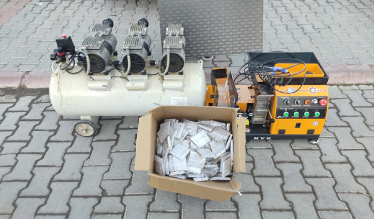Belirlenen adrese düzenlenen operasyonda, 3 elektrikli sigara doldurma makinesi, 3 hava kompresörü, 10 binin üzerinde boş ve dolu makaron ile bandrolsüz tütün ele geçirildi.