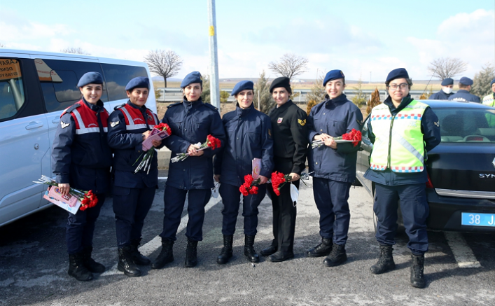 Kadın jandarmalar, Kayseri-Ankara kara yolu uygulama noktasında durdurdukları araçların kadın sürücülerine, araçlarda ve yolcu otobüsünde seyahat eden kadınlara karanfil verdi. Kadın sürücü ve yolcular, jandarma personeliyle günün anısına fotoğraf çektirdi.
