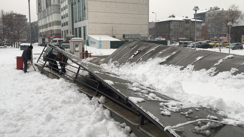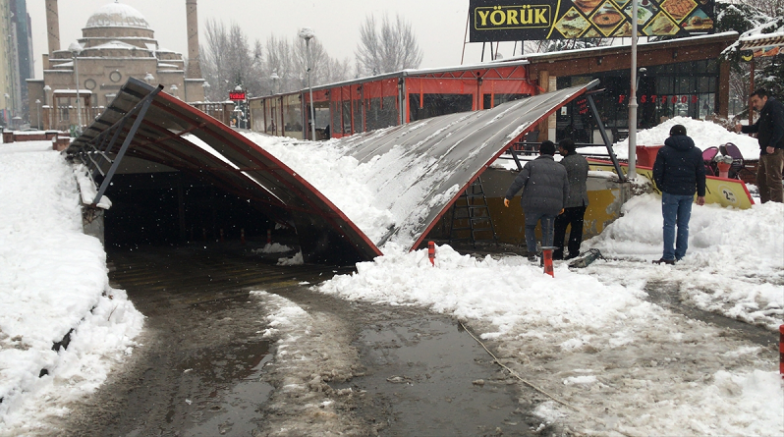 Kayseri'nin Kocasinan ilçesi Gür Sokak'ta bulunan kapalı otoparkın girişine polikarbon malzemeden yapılan çatı, kar birikintisi nedeniyle çöktü.