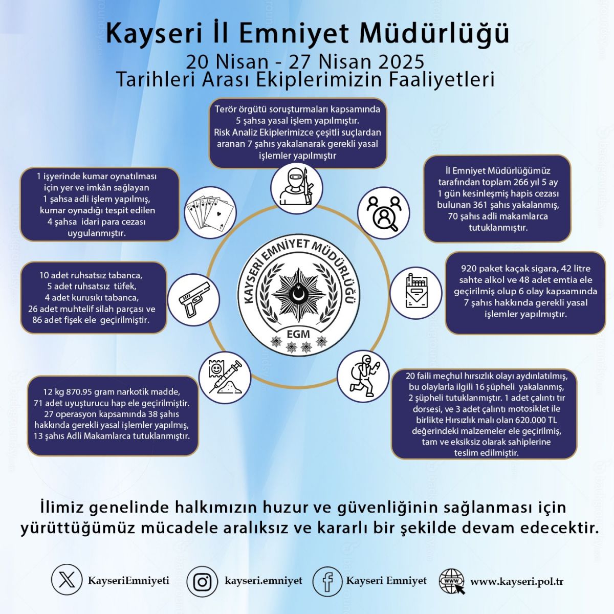 Kayseri İl Emniyet Müdürlüğü 20-27 Nisan 2025 tarihleri arasında ekiplerin bir haftalık çalışmaları hakkında bilgilendirmede bulundu.