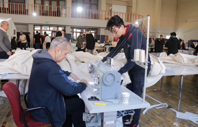 Çadır üretimi için bir yandan halk eğitim merkezlerinin usta öğreticileri ve öğretmenleri dikiş makinesinin başına geçerken, öğrenciler de kumaşların ve çadırların taşınmasına yardım ediyor.
