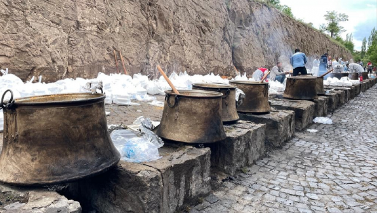 Yaklaşık 70 kişi tarafından 50 kazanda etli bulgur pilavı pişirilerek vatandaşlara dağıtıldı.