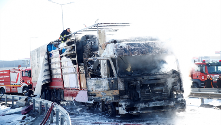 İtfaiye ekiplerinin müdahalesiyle söndürülen yangın nedeniyle tır ve mobilyaların bir kısmı zarar gördü.