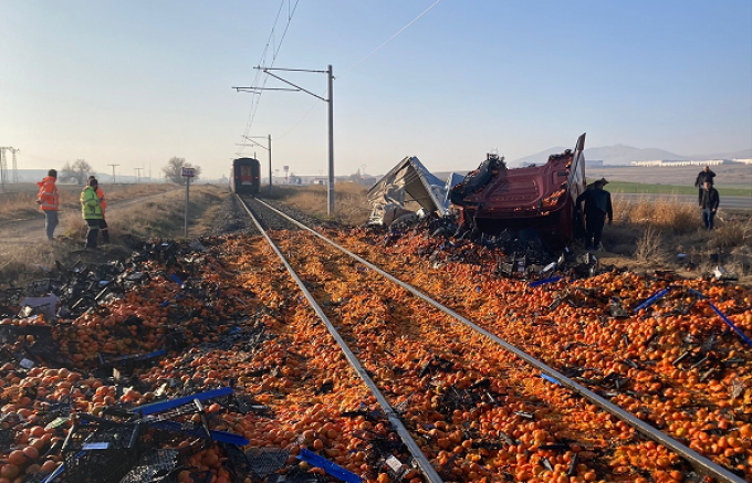 Tırın dorsesindeki narenciyeler demir yoluna saçıldı.