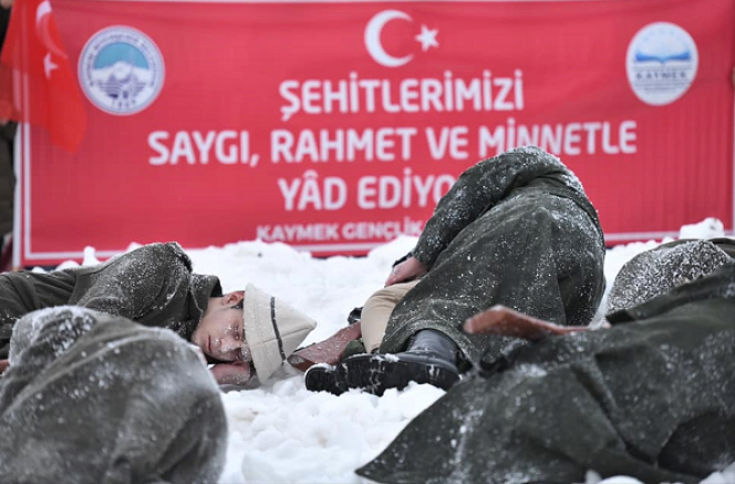 Kayseri Mesleki Eğitim ve Kültür AŞ (KAYMEK) tarafından Sarıkamış şehitlerini anma programı için Erciyes Dağı'ndan kamyonla getirilen kar, Cumhuriyet Meydanı'ndaki alana döküldü. 108 yıl önceki askerlerin kıyafetlerini giyen öğrenciler, karın üstüne uzanıp şehitleri andı.