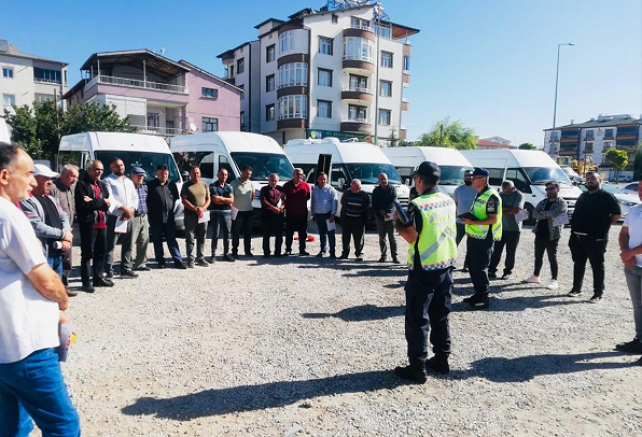 Şoförlere, okul servis araçları yönetmeliğinde belirtilen hususlarla ilgili bilgi veren ekipler, güvenli servis kullanım kartı dağıttı.