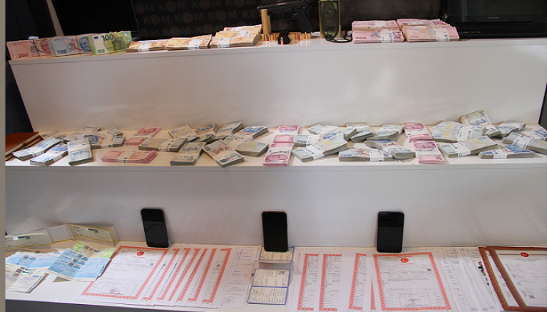 İl Emniyet Müdürlüğü Kaçakçılık ve Organize Suçlarla Mücadele Şubesi ekipleri, iş yerinde 787 bin lira, 1372 aracın satış sözleşmesi, 107 tapu, 70 çek, ruhsatsız tabanca ve dijital materyaller ele geçirdi.