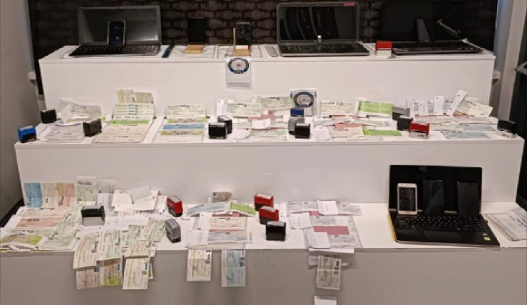 Şüphelilerin adreslerinde yapılan aramalarda ele geçirilen 120 çek, 20 senet, 23 kaşe ile çok sayıda evrak, doküman ve dijital materyale el konuldu.