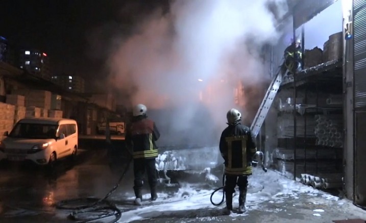 İş yerindeki plastik boruların tutuşmasıyla büyüyen yangını fark eden kağıt toplayıcısının haber vermesi üzerine olay yerine çok sayıda itfaiye ve polis ekibi sevk edildi.