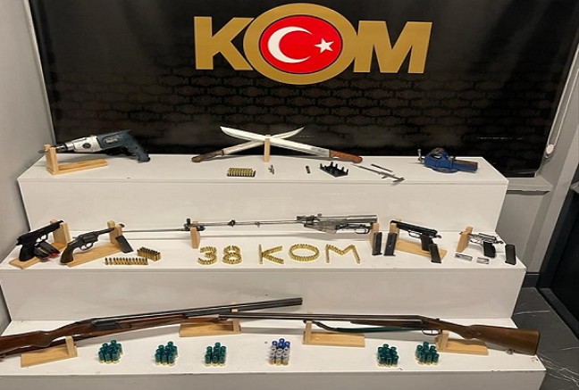 Bu kapsamda farklı adreslerde yapılan aramada, otomatik tüfek, 3 ruhsatsız tabanca, 7 tabanca şarjörü, üzerinde tadilat yapılmış tabanca gövdesi, 237 farklı çaplarda tabanca fişeği, 2 ruhsatsız av tüfeği, 63 av tüfeği fişeği, 2 kesici alet, silah yapımında kullanılan mengene ve taşlama ucu takılı matkap ele geçirildi.