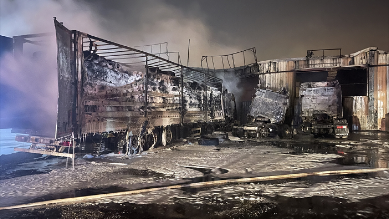 10 dükkan ve 3 tırın kullanılamaz hale geldiği yangın yaklaşık 2 saatlik çalışmanın ardından kontrol altına alındı.
