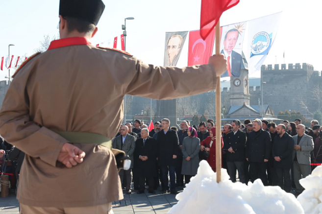 Kayseri Cumhuriyet Meydanı’nda Sarıkamış Harekâtı’nın 109’uncu yıl dönümü dolayısıyla düzenlenen şehitleri anma programına Büyükşehir Belediye Başkanı Dr. Memduh Büyükkılıç’ın yanı sıra AK Parti Kayseri Milletvekilleri Şaban Çopuroğlu, Murat Cahid Cıngı, AK Parti İl Başkanı Fatih Üzüm, Melikgazi Belediye Başkanı Mustafa Palancıoğlu, Kocasinan Belediye Başkanı Ahmet Çolakbayrakdar, Talas Belediye Başkanı Mustafa Yalçın, Hacılar Belediye Başkanı Bilal Özdoğan, Kayseri Üniversitesi Rektörü Prof. Dr. Kurtuluş Karamustafa, Büyükşehir Belediyesi Genel Sekreteri Hüseyin Beyhan, ellerinde Türk bayrakları ile gençler ve vatandaşlar katıldı.
