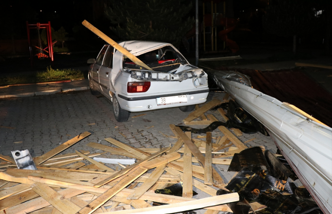 Kayseri'nin Melikgazi ilçesinde şiddetli rüzgar nedeniyle bir binanın çatısı düştü.