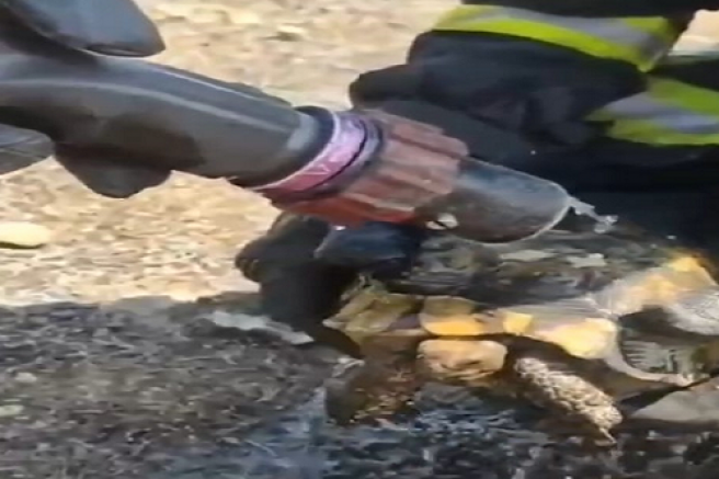 İtfaiye erlerinin suyla serinlettikleri kaplumbağayı doğaya bıraktığı anlar, amatör kameralara yansıdı.