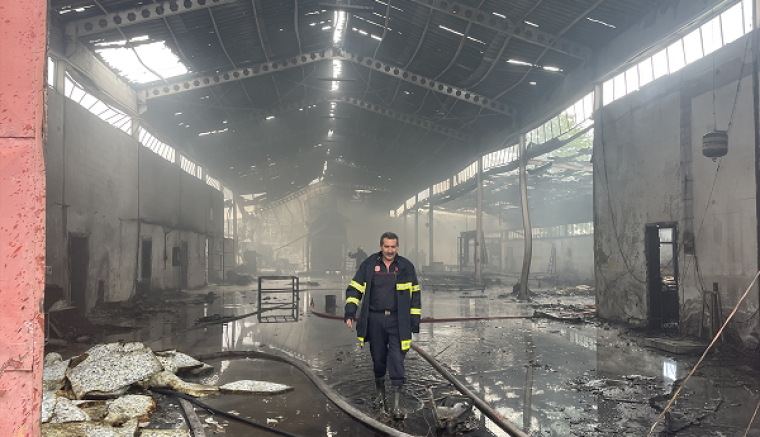 Çatısı kısmen çöken fabrikada itfaiye ekiplerinin soğutma çalışmaları devam ediyor.