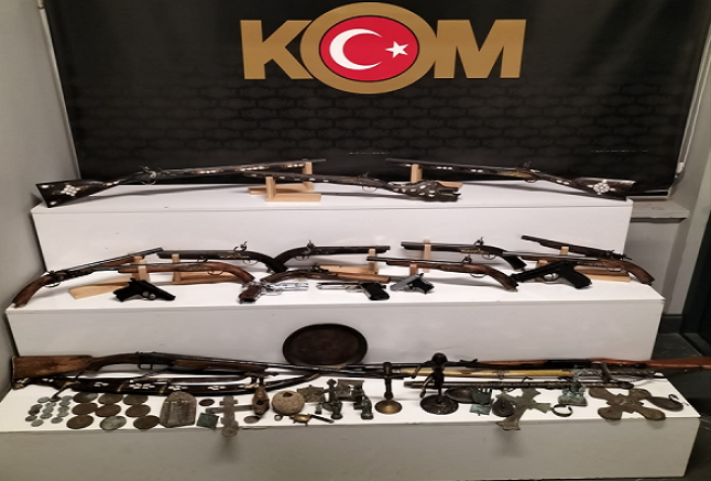Operasyonda tarihi eser niteliği taşıdığı değerlendirilen 45 sikke, 9 tabanca, 3 tüfek ve 3 kılıç ile 2 ruhsatsız av tüfeği ve 5 kuru sıkı tabanca ele geçirildi.