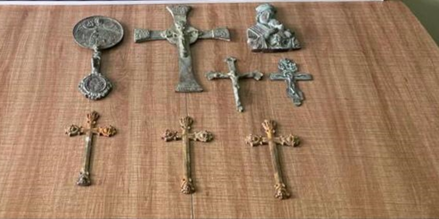Şüphelilerin ellerindeki torbaya sarılı vaziyette, tarihi eser niteliği taşıdığı değerlendirilen 8 obje ele geçirildi.