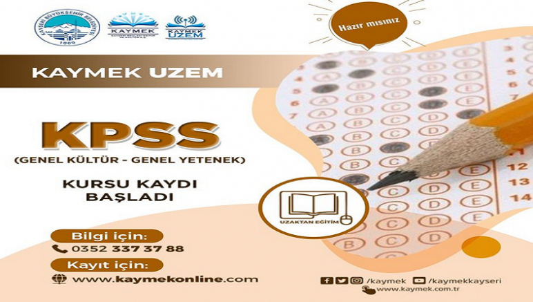 Büyükşehir Belediyesinden yapılan yazılı açıklamaya göre, belediye bünyesinde faaliyet gösteren Kayseri Mesleki Eğitim ve Kültür AŞ (KAYMEK), Uzaktan Eğitim Merkezi (UZEM) birimiyle birlikte KPSS'ye hazırlık sürecinde ücretsiz kurs verecek.