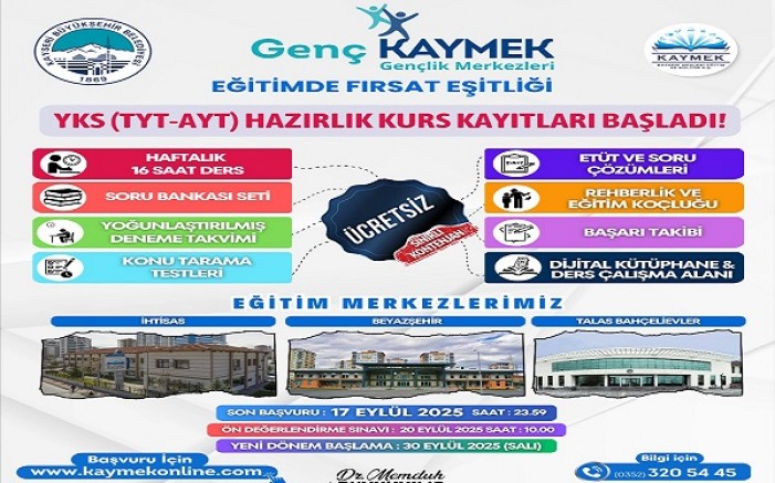 Kayseri Büyükşehir Belediyesi, gençlerin eğitim hayatına katkı sunmaya devam ediyor. Genç KAYMEK Gençlik Merkezleri’nde 2026 yılı üniversiteye hazırlık sürecindeki gençlere yönelik düzenlediği ücretsiz YKS Hazırlık Kursları kayıtları başladı. Kurslar üç farklı merkezde gerçekleştirilecek.