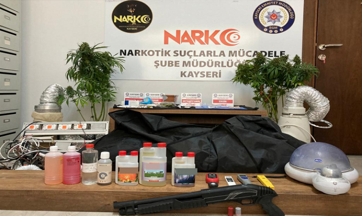 Operasyonda 30 gram eroin, 4 gram sentetik uyuşturucu, 72 sentetik hap, 6 gram esrar ve bir hassas terazi, kenevir imalatı için düzenek, bir ışık ölçer cihaz, bir güneş ışığından korumak için çadır, bir ölçüm cihazı, 15 fan, 9 led ışık, 3 alüminyum havalandırma borusu, bir nemlendirme cihazı, 7 kenevir bitkisi yetiştirme amaçlı kimyasal ilaç ile bir ruhsatsız av tüfeği ele geçirildi.