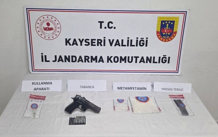 Valilikten yapılan açıklamada ''Kayseri İl J.K.lığı/İsth.Şb.Md.lüğü tarafından yapılan çalışmalar sonucunda; Melikgazi İlçesinde  O.Ö. isimli şahsın üzerinde ve ikametinde,  İsth.Şb.ve NSM.Şb.Md.lüğü ile Melikgazi İlçe J.K.lığınca 31.03.2026 günü yapılan adli arama neticesinde; 162 Gram Metamfetamin Uyuşturucu Madde,1 Adet Hassas Terazi, 1 Adet Uyuştucu Kullanma Aparatı,1 Adet Kuru Sıkı Tabanca ve Tabancaya ait 33 Adet Dolu Fişek, ele geçirilmiş olup; olayla ilgili olarak şüpheli şahıs gözaltına alınarak adli tahkikata başlanmıştır.'' ifadeleri yer aldı.