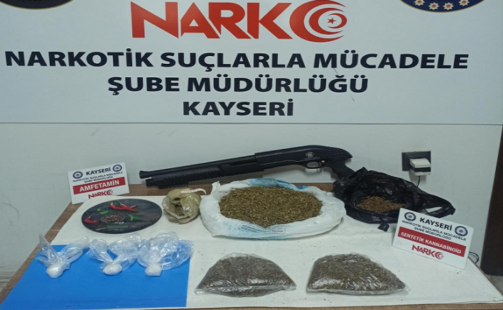 Zanlıların ikametine düzenlenen operasyonda 875 gram sentetik uyuşturucu, hassas terazi ve pompalı tüfek ele geçirildi.