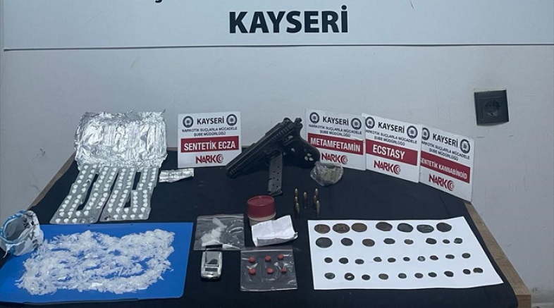 Otomobilde ve zanlının üzerinde yapılan aramada 55 gram sentetik uyuşturucu, 143 sentetik hap, ruhsatsız tabanca ve hassas terazi ele geçirildi.
