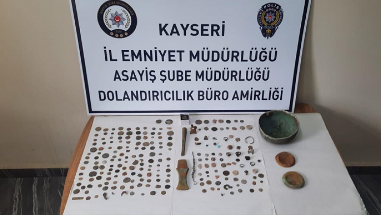 İl Emniyet Müdürlüğü Asayiş Şube Müdürlüğü Güven Timleri tarafından Melikgazi İlçesi Cumhuriyet Mahallesi'nde S.A. (31), M.S. (29) ve Suriye uyruklu N.M'nin (22) üst aramasında tarihi sikke, takı ve obje bulundu.