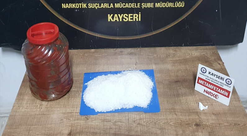 Kayseri'de yolcu otobüsünde salça bidonuna gizlenmiş 500 gram sentetik uyuşturucu bulundu, bir şüpheli gözaltına alındı.
