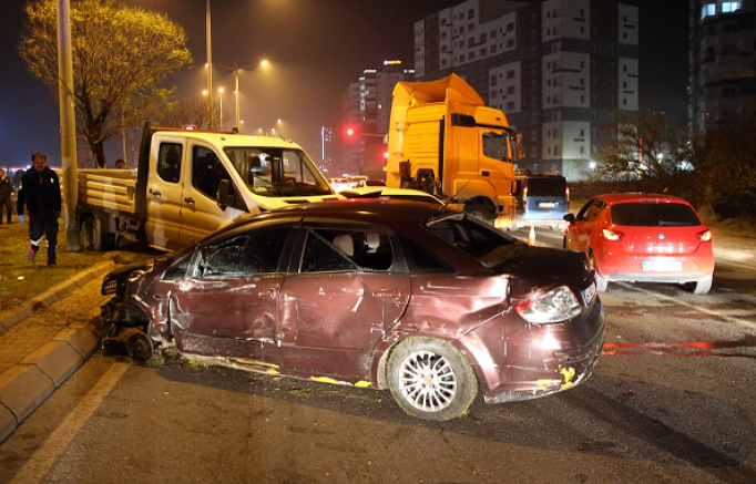 Karşı şeride geçen araçlardan tır ve kamyonet, 34 AGF 107 plakalı otomobile çarptı.