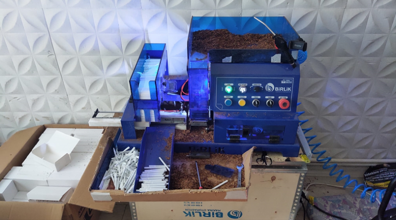 Aramada, 1 elektronik sigara doldurma makinesi, 1 hava kompresörü, 38 bin 600 makaron (filtreli sigara kağıdı), 31 kilogram tütün ve 12 TAPDK bandrolü ele geçirildi.
