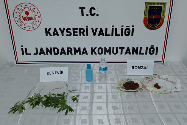Evde yapılan aramada, 60 gram bonzai, 5 kök Hint kenevir, 1 bonzai yapımında kullanılan sıvı madde ve 1 uyuşturucu madde kullanma aparatı ele geçirildi.