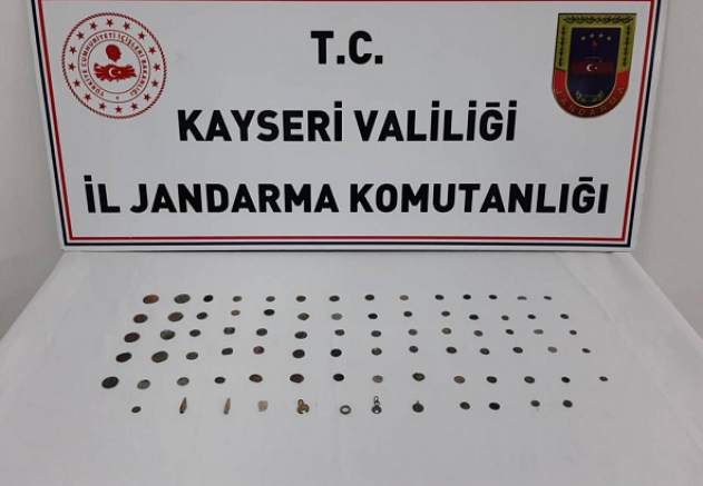 Kayseri'nin Develi ilçesinde jandarma ekipleri tarafından yapılan çalışmalarda 75 adet tarihi sikke, 7 adet obje ele geçirildi.