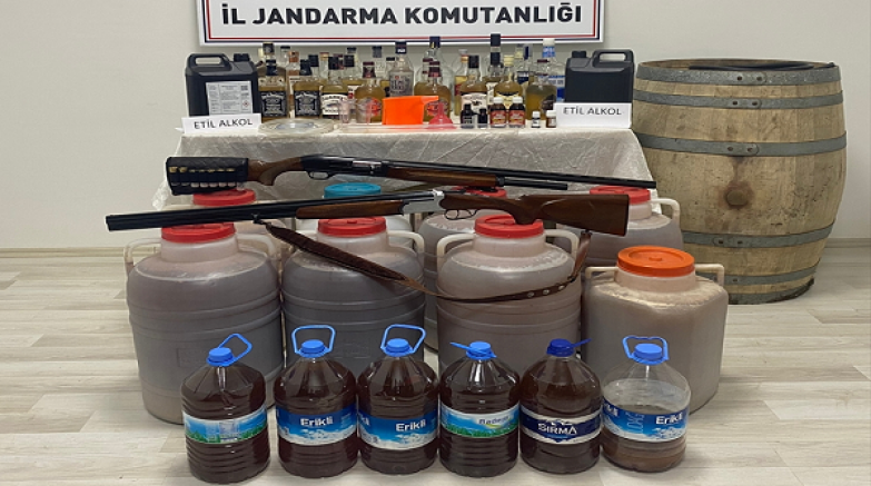 Kayseri'nin Sarıoğlan ilçesinde 426 litre sahte içki, 10 litre etil alkol, 2 ruhsatsız av tüfeği ele geçirildi, bir şüpheli gözaltına alındı.
