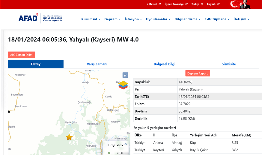 Afet ve Acil Durum Yönetimi Başkanlığının (AFAD) internet sitesinde yer alan bilgiye göre, merkez üssü Kayseri'nin Yahyalı ilçesinde 4 büyüklüğünde sarsıntı kaydedildi.