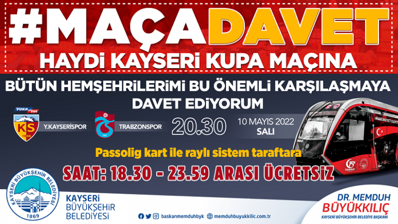 Ziraat Türkiye Kupası Yarı Final ikinci maçında rakibi Trabzonspor ile karşı karşıya gelecek olan Yukatel Kayserispor’a destek çıkan Büyükşehir Belediye Başkanı Dr. Memduh Büyükkılıç, 10 Mayıs Salı günü Kadir Has Stadyumu’nda saat 20.30’da başlayacak karşılaşma için taraftarın ulaşımının ücretsiz olması talimatını verdi. Karşılaşma günü belirlenen saatlerde tramvaylarda passolig kartı olan taraftarlar için ulaşım ücretsiz olacak.