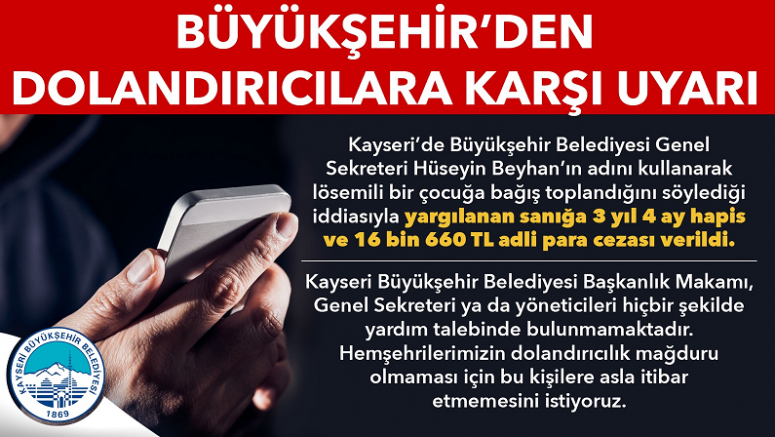Kayseri Büyükşehir Belediyesi Genel Sekreteri Hüseyin Beyhan'ın adını kullanıp lösemili bir çocuğa bağış toplayan sanık, dolandırıcılık iddiasıyla yargılandığı davada 3 yıl 4 ay hapis ve 16 bin 660 lira adli para cezasına çarptırıldı.